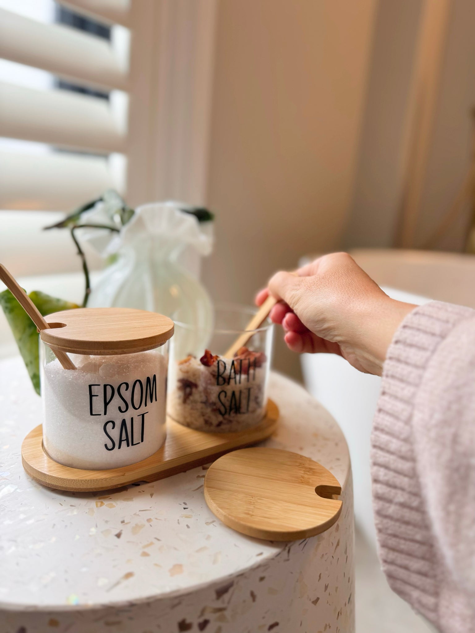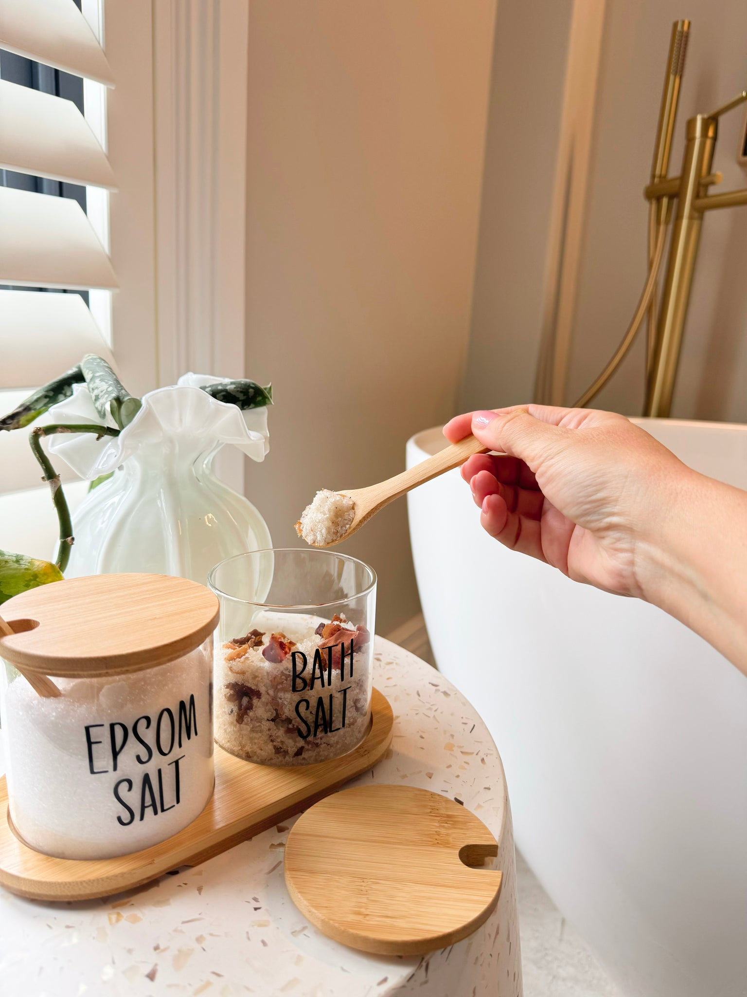 This glass and bamboo bath salt set is the perfect combination of functionality and style, making it a must-have for any bathroom. The set includes two sleek glass jars with bamboo lids and spoons, one for bath salts and the other for Epsom salts, allowing for organised and easy access. The natural bamboo adds a touch of eco-friendly elegance to your space, while the transparent glass lets you see the contents clearly, adding both practicality and charm. Whether you’re looking to enhance your self-care routine or elevate the aesthetics of your bathroom, this set provides an ideal blend of sustainability, durability, and visual appeal. The included bamboo tray keeps the jars neatly in place, ensuring your bathroom stays tidy and organised.